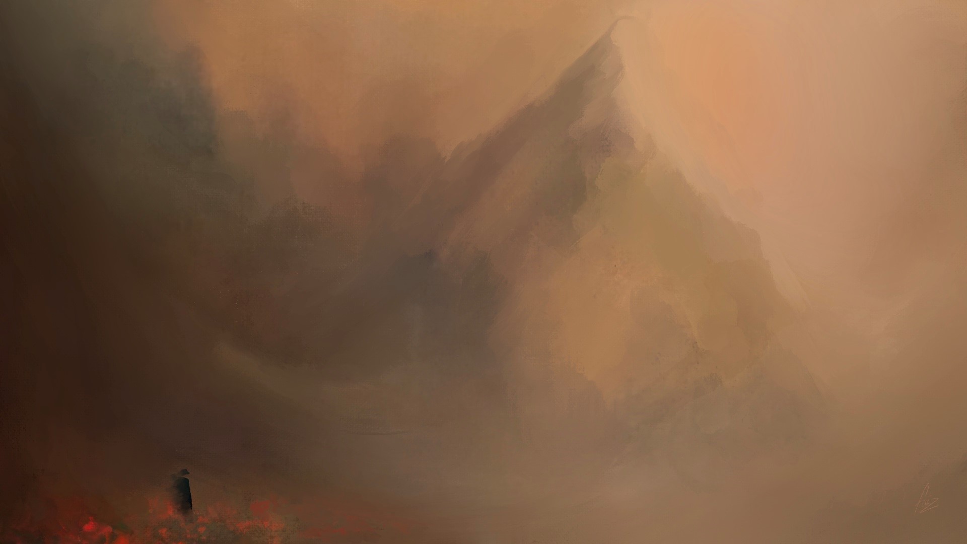 Dans l'interstice fragile entre le réel et l'imaginaire surgit un tableau vivant, une romance visuelle et solitaire. Un homme, silhouette de brume et de désir, s'abandonne au royaume des possibles infinis. Les fleurs l'enlacent, corolles de velours et de mélancolie. Leurs pétales tremblent aux mouvements des songes, racontant des histoires de tendresse et d'errance. Au loin, la montagne, sentinelle de granite et de silence, veille, gardienne des horizons intérieurs. Ses lignes s'estompent, se fondent, se déforment, comme les contours incertains d'un souvenir qui s'efface. Chaque nuance est une émotion suspendue, indicible. Entre réalité et songe, il demeure entre deux.